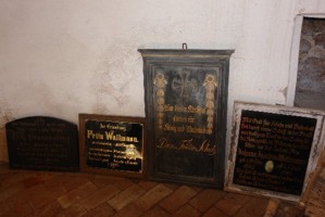 Drei Tafeln in der Maxdorfer Feldsteinkirche aus dem 15. Jahrhundert. Die Holztafel für den 1. Weltkrieg