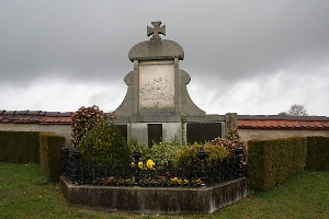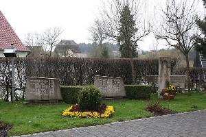 a) Im Friedhof; in der Mitte erhöht, oben mit Deutschem Kreuz und Bildrelief „Jesus segnet Sterbenden“, Gedenktafeln (1. Weltkrieg); b) Bei der Kirche; Betonkreuz mit Bildrelef „Jesus“ und zwei Gedenktafeln (2. Weltkrieg); c) Zusätzlich Hinweise zu Soldaten von privaten Gedenksteinen