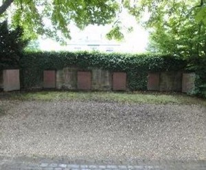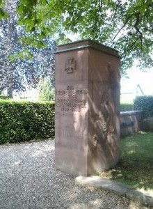 Auf dem Friedhof befindet sich die Gedenkstätte. Sechs Sandsteintafeln nebeneinander an der Friedhofsmauer. Links davon eine viereckige Säule mit Inschrift und zwei Figuren. Als Verbindung zur Friedhofsmauer ist eine weitere Mauer mit Inschrift eingefügt.