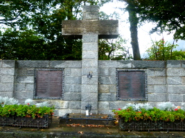 Kreuz aus Steinquadern an der Friedhofsmauer, rechts und links davon mit Lorbeer gerahmte Kupfertafeln mit eingeprägten Namen.