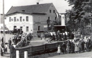 Auf Anregung des Kriegervereins wird in den 30er Jahren des des 20. Jahrhunderts inmitten der Straßengabelung das Kriegerdenkmal durch den Bauunternehmer August Pohl errichtet. Das Material ist aus Granit. Die Vorderseite des Denkmals ist mit Platten aus dem Marmor-Steinbruch in Groß Kunzendorf verkleidet und mit einer Inschrift sowie den Namen der Gefallenen versehen. Die in dreiecksform gehaltene Denkmalanlage wird mit einem Holzzaun umgeben. An der feierlichen Einweihung nehmen etwa 12 Fahnenabordnungen teil. Die Einsegnung erfolgt durch Pfarrer Bernhard Köhler. Ab Mitte März 1945 finden gefallene deutsche Soldaten aus dem nahen Frontabschnitt hier die letzte Ruhe. Da in den Wochen vor Kriegsende nur noch wenige Verlustmeldungen Berlin erreichen, sind nur vier auf dem Denkmalplatz beerdigte Soldaten namentlich bekannt.