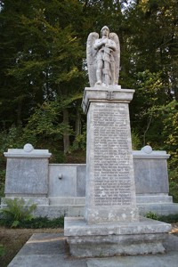 oberhalb der Stadt, in der Nähe der Sportplätze; quadratische Säule, oben Krieger mit Flügel und Schwert, vorne Namen, hinten Inschrift, dahinter Gedenkwand; zusätzlich Hinweise zu Soldaten von privaten Gedenksteinen