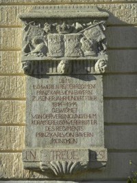 München (Prinz-Leopold-Kaserne: 1. Schwere-Reiter-Regiment), Oberbayern, BayernZementplatte an der Seite der ehemaligen Prinz-Leopold-Kaserne. Römisch/Griechische Helme, Brustpanzer und die Bayerische Krone über drei Löwenköpfen (ohne Namen).
