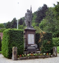 Ehrenmal hinter der romanischen ehemaligen Klosterkirche St. Leodegar neben dem Friedhof. Über einem Sockelblock mit reichem Dekor und Inschrifttafeln ragt ein Standbild der Jungfrau von Orléans (Jeanne d´Arc).