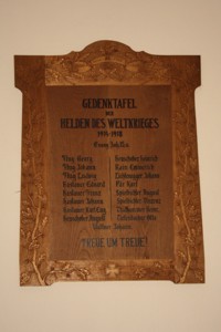 Tafel 1: Gedenktafel der Helden des Weltkrieges 1914 - 1918 Evang.Joh. 15.13 (Namen) Treue um Treue!