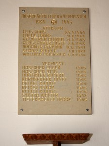 drei Gedenktafeln in der Kirche, eine davon mit Fotos (die Tafeln 2 mit Fotos und die Tafel 3 mit Todesdaten wurden zusammengefasst); zusätzlich Hinweise zu Soldaten von privaten Gedenksteinen