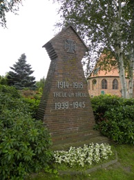 Auf dem Gemeindefriedhof links von der 1504 geweihten Trinitatiskirche: Ein Pfeilförmiges Denkmal aus rotem Klinker. Auf der Vorderseite im oberen Teil ein Eisernes Kreuz, darunter eine Inschrift. Auf der Rückseite eine Gedenktafel aus Bronze (ohne Jahreszahl).In der Kirche drei Gedenktafeln für die Kriegstoten von