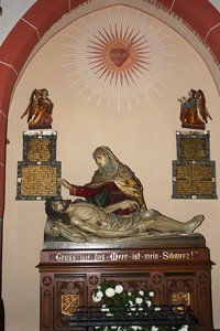 in der Kirche; in einer Nische, zwei Gedenktafeln mit Engelsfigur darüber, davor Steinplastik „Maria mit verstorbenem Jesus“; zusätzlich Hinweise zu Soldaten von privaten Gedenksteinen