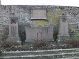 Das Kriegerdenkmal steht an der Außenmauer des Pfarr/Klostergartens an der Ortsdurchfahrt. In der Mitte ein Sandsteinkreuz mit Inschrift daneben anschließend die Namensplatten (2. WK). Links eine Sandsteinsäule (1870-71). Rechts eine Sandsteinsäule (1914) beide jeweils mit einem Helm als Abschluß. Auf der Frontseite ein deutsches Kreuz mit Eichenlaub. An der Mauer befestigt eine Gedenkplatte (1914-1918) stark verwittert und unlesbar