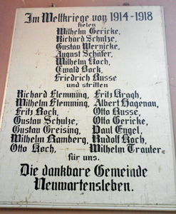 Tafel 1. Weltkrieg: Im Weltkriege 1914-1918 fielen: (Namen) stritten: (Namen) für uns. Die dankbare Gemeinde Neuwartensleben