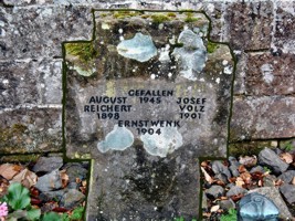 Kriegsgräber auf dem Friedhof neben der Pfarrkirche St. Ulrich. Zwei Steinkreuze tragen sechs Namen
