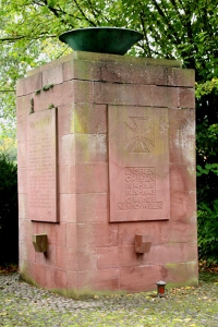 Kriegerdenkmal auf dem Friedhofsgelände zwischen Kirche, Trauerhalle und Gräbern, bestehend aus einem aus Sandstein gemauerten Quader, obendrauf eine Bronzeschale. Auf allen vier Seiten Sandsteintafeln mit Inschrift vorne und den Namen der Opfer beider Weltkriege links, rechts und hinten