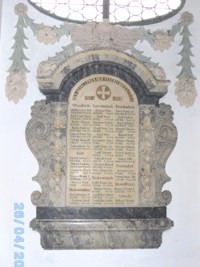 Verzierte Steinrelieftafel im Vorraum der Klosterkirche mit Inschrift und Namen der Opfer des 1. Weltkrieges.