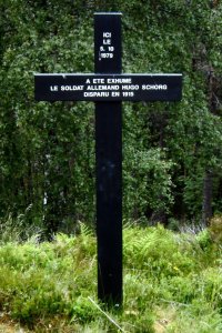 Orbey (Urbeis, Elsass), Département Haut-Rhin, FrankreichPLZ 68370 Einzeldenkmal: Schwarzes Gedenkkreuz auf dem Kampfplatz Lingekopf (le Linge) in den Vogesen.