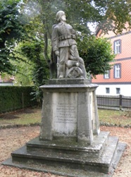 In der Ortsmitte das Ehrenmal für die 8 und 14 Kriegstoten beider Weltkriege, darauf die Plastik eines Soldaten.