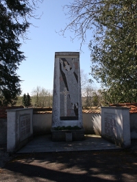 Im Friedhof; rechteckige Säule flankiert von zwei Gedenktafeln