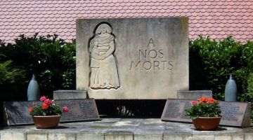 Ehrenmal neben der Kirche St. Martin. Eine vertikale Platte aus hellem Naturstein trägt eine Inschrift und ein Halbrelief: Trauernde Frau in Tracht mit Kind. Davor vier Metalltafeln mit den Namen der Opfer beider Weltkriege.