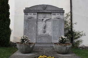 Bei der Kirche; in der Mitte Bildrelief „Heiland am Kreuz“, Gedenktafeln; an zwei Stellen Soldatengräber; vor der Kirche, Steinkreuz unter einem Busch; im Friedhof, als Grab gestaltet