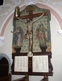 In der kath. Kirche eine Gedenktafel an der Wand, darüber ein Kruzifix und zwei Heiligenfiguren; eine weitere Gedenktafel neben dem Seiteneingang (ohne Namen)