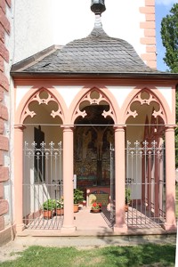 Gedenkkapelle angebaut an die Kirche St. Michael; Bildnis aus Mosaiksteinen mit Inschriften, Gedenktafeln an der Seitenwand