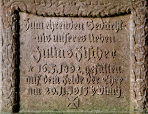 Auf dem Grabstein: Zum ehrenden Gedächt- nis unseres lieben Julius Fischer * 16.5.1892, gefallen auf dem Felde der Ehre am 20.11.1915 b/Vimy