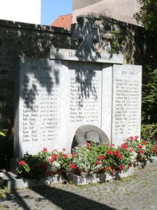 Denkmal aus Granitstein in der Ortsmitte mit Inschrift und den Namen der Weltkriegsopfer. Oben aufgesetzt ein großes EK aus Stein. Verziert mit einem Pflanzbeet und mittig ein Stahlhelm mit Siegerkranz.