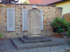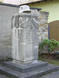 Stele mit aufgesetztem Stahlhelm in Altwahnsdorf. Die Namen der Gefallenen des 1. Weltkrieg an der Stele sind