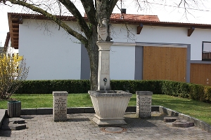 Bei der Kirche als Brunnen gestaltet, hinter dem Brunnen eine Säule, oben mit Adler und Schild, seitlich