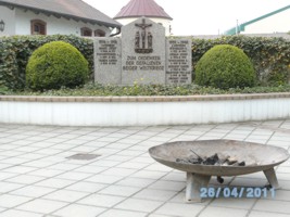 Steindenkmal neben dem Ortsfriedhof mit Inschrift und Namen der Weltkriegsopfer. Verziert mittig mit der Kreuzigungsdarstellung. Bogenförmiges Bepflanzungsbeet, als Dekor.