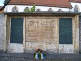 Steintafel in einer überdachten Nische an der Kirchhofmauer in Grunbach. Die Namen der Toten unter einem Relief kämpfender Soldaten.