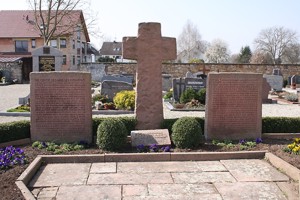 Im Friedhof; Zwei Steinkreuze, flankiert von zwei Steintafeln, davor am Boden Steintafel; zusätzlich Hinweise