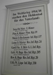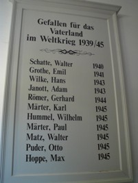 1. Weltkrieg: Im Weltkrieg 1914/18 starben den Heldentod fürs Vaterland: (Namen) 2. Weltkrieg: Gefallen für das Vaterland im Weltkrieg 1939/45: (Namen)