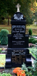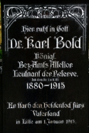 Auf dem Grabstein: Hier ruht in Gott Dr. Karl Bold Königl. Bez.-Amts Assessor Leutnant der Reserve Inh. d. eis. Kr. I. u. II. Kl. 1880-1915 Er starb den Heldentod fürs Vaterland in Lille am 1. Januar 1915.