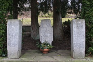 im Friedhof; drei Steinsäulen, mittlere mit Bildmotiv „drei Personen“