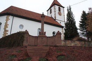 bei der Kirche; Denkmal aus rotem Sandstein, Mauer in einem Halbkreis, in der Mitte runde Säule, am Fuss der Säule zwei sitzende Adler, unterhalb des Denkmals Widmungstafeln in Schildform