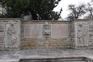 Neben dem Eingang zur Kirche das Gefallenen-Denkmal für den Ersten und Zweiten Weltkrieg: Eine Mauer mit eingelassenen Gedenktafeln. Links eine trauernde Frau mit Kind, rechts ein Ehepaar, in der Mitte ein Jesuskopf mit gekreuzten Armen.