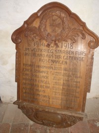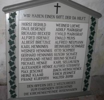 Rosenhagen, Stadt Perleberg, Landkreis Prignitz, BrandenburgPLZ 19348 Denkmal 1. Weltkrieg, aufgerichteter Granitblock auf Granitsockel; Gedenktafeln in der Kirche; Soldatengrab