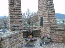 Das Kriegerdenkmal befindet sich auf dem Friedhof. In einer mit Sandsteinen verkleideten Mauer erheben sich zwei nach hinten verjüngende Wände. In diese sind zwei Namenstafeln aus Metall eingefügt.
