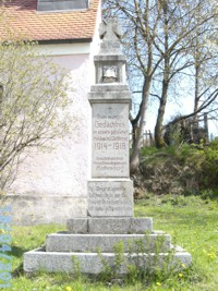 Denkmal neben der Ortskapelle mit Inschrift und Namen der Opfer des 1. Weltkrieges. Auf sich nach oben verjüngenden Treppenpodest stehende Steinsäule mit EK-Abschluss. Als Zieremblem ein Stahlhelm mit Eichenlaub.