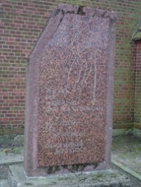 Allgemeines Denkmal für Kriegsopfer, aufgerichtete rote Granitplatte mit eingraviertem Motiv eines sterbenden und eines trauernden; Gedenktafel 1. Weltkrieg und Täfelchen 2. Weltkrieg in der Kirche; Familien Gedenkgrab