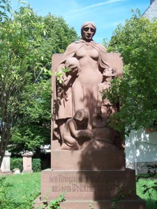 Schriftzug auf der Vorderseite 1. Weltkrieg: Den Kriegsopfern unserer Gemeinde aus dem Weltkrieg 1914-1918 Schriftzug auf der Rückseite Krieg 1870-71: Niemand zeigt größere Liebe als der der sein Leben gibt für die Gemeinschaft Zur Erinnerung an den Feldzug 1870-1871 (Namen)