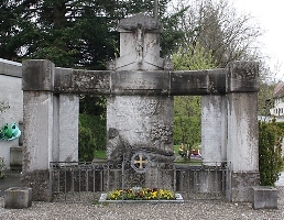 Im Friedhof; Denkmal im Halbkreis. Inschriften an den vier Säulen