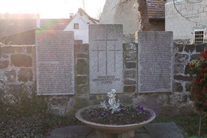 Bei der Kirche; drei Gedenktafeln an einer Mauer; zusätzlich Hinweise zu Soldaten von privaten Gedenksteinen