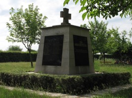 Auf dem Friedhof steht das fast würfelförmige Denkmal. An zwei Seiten sind je eine Marmortafel mit den Namen angebracht. An der dritten Seite ist eine Marmortafel mit der Inschrift zu sehen. Obenauf trägt das Denkmal ein eisernes Kreuz.