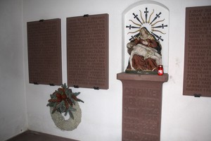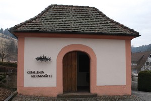 im Friedhof; Gedenkkapelle, aussen Inschrift und Dornenkranz, innen vier Gedenktafeln an der Wand, dazwischen Stehpult mit Maria und verstorbenen Jesus darauf; zusätzlich Hinweise zu Soldaten von privaten Gedenksteinen