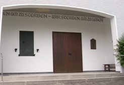 An der Außenseite der Friedhofskapelle zwei Tafeln zum Gedenken der 28 und 82 Kriegstoten beider Weltkriege.
