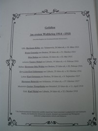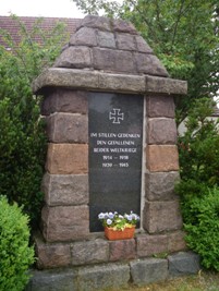 Das Denkmal für die Gefallenen beider Weltkriege war früher ein Denkmal für die Gefallenen des 1. Weltkriegs. Die Tafel darin wurde entfernt und nach der Wiedervereinigung durch eine allgemeine Gedenktafel ersetzt. Die Namen des 1. Weltkriegs sind in einer Ortschronik erhalten. Zusätzliche Informationen in Blau vom Volksbund Deutsche Kriegsgräberfürsorge: www.volksbund.de/graebersuche
