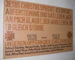 Denkmal: In stillem Gedenken den Gefallenen beider Weltkriege, 1914-1918, 1939-1945 Tafel 2. Weltkrieg: 1939-1945 Unseren Opfern des 2. Weltkriegs (Namen) Jesus Christus spricht: Ich bin die Auferstehung und das Leben, wer an mich glaubt, der wird leben, ob er gleich stürbe. Gedenkblatt 1. Weltkrieg: Gefallen im 1. Weltkrieg