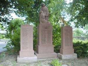 Das Kriegerdenkmal besteht aus eine Sandsteinsäule mit zwei Figuren (Jesus und ein kniender Soldat) sowie zwei einzeln stehenden Namenssteinen.