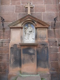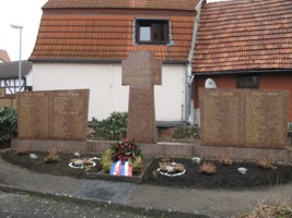 Vor der Kirche steht ein Denkmal aus rötlichem Sandstein für die Gefallenen des 1. Weltkrieges.